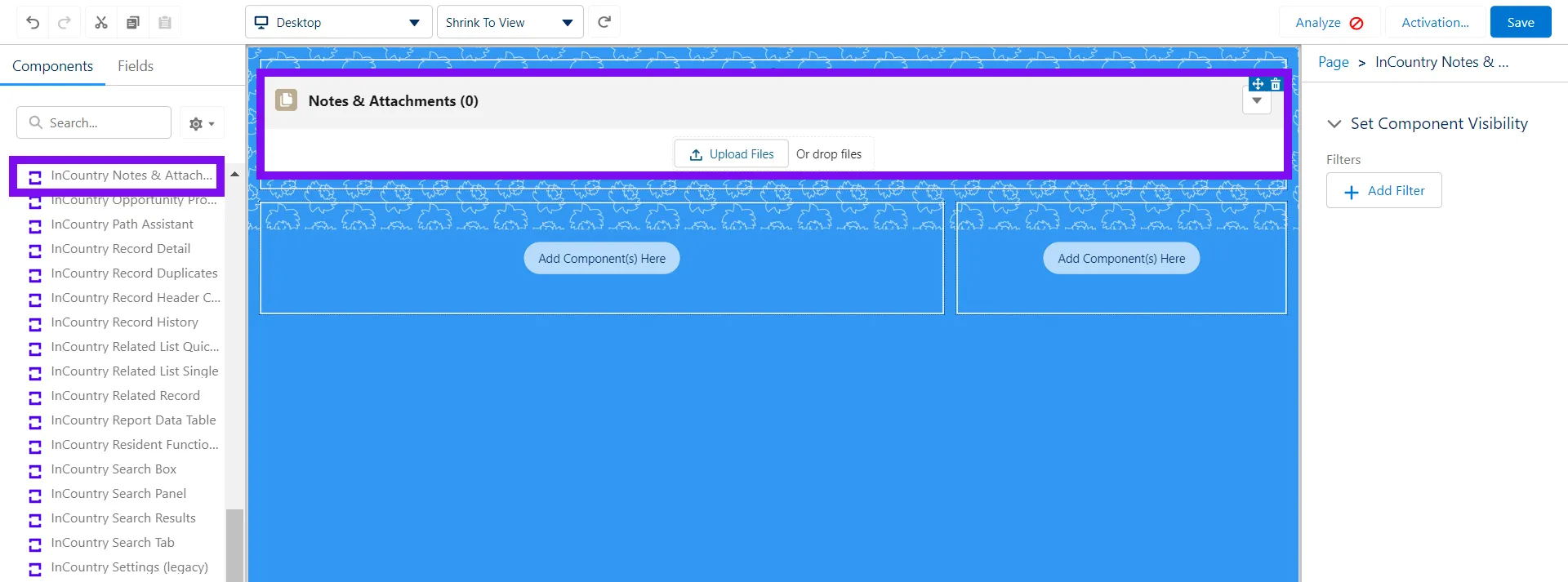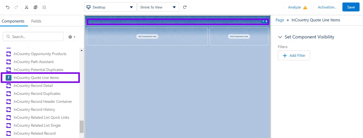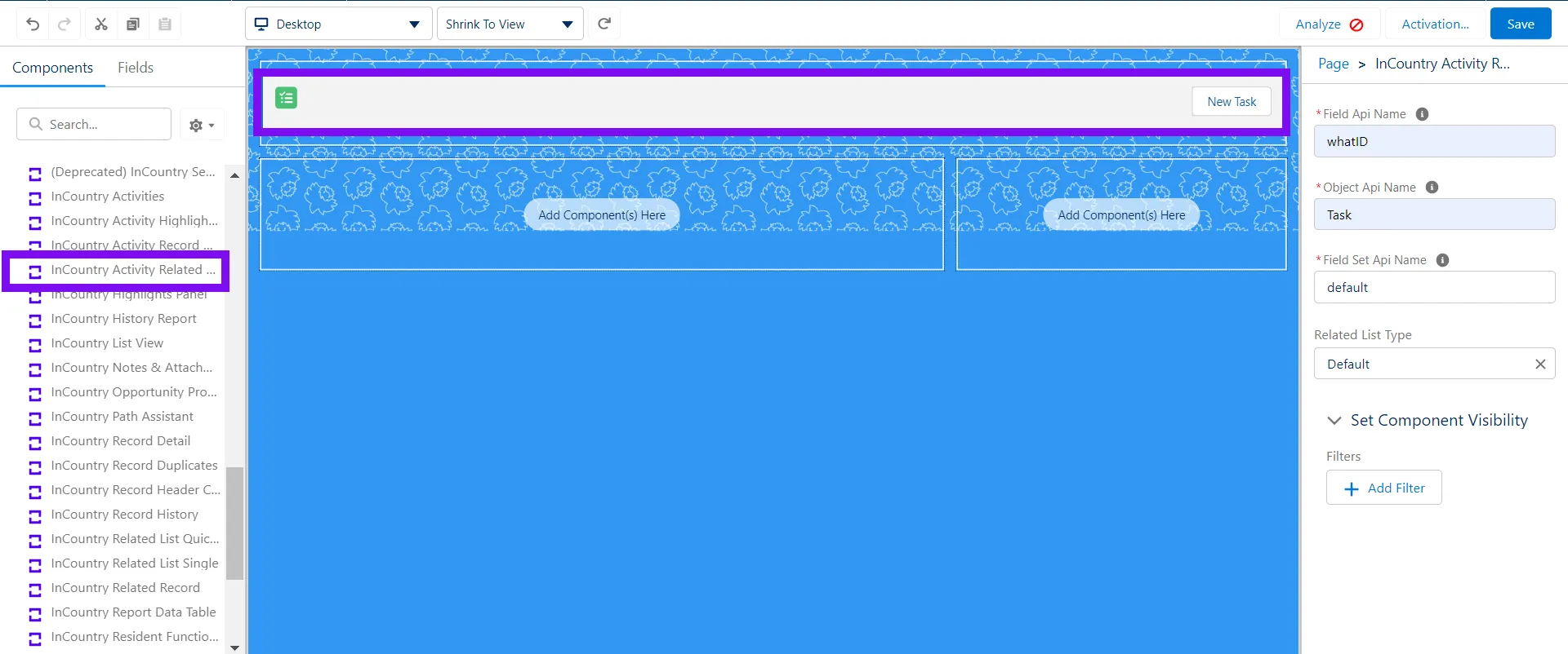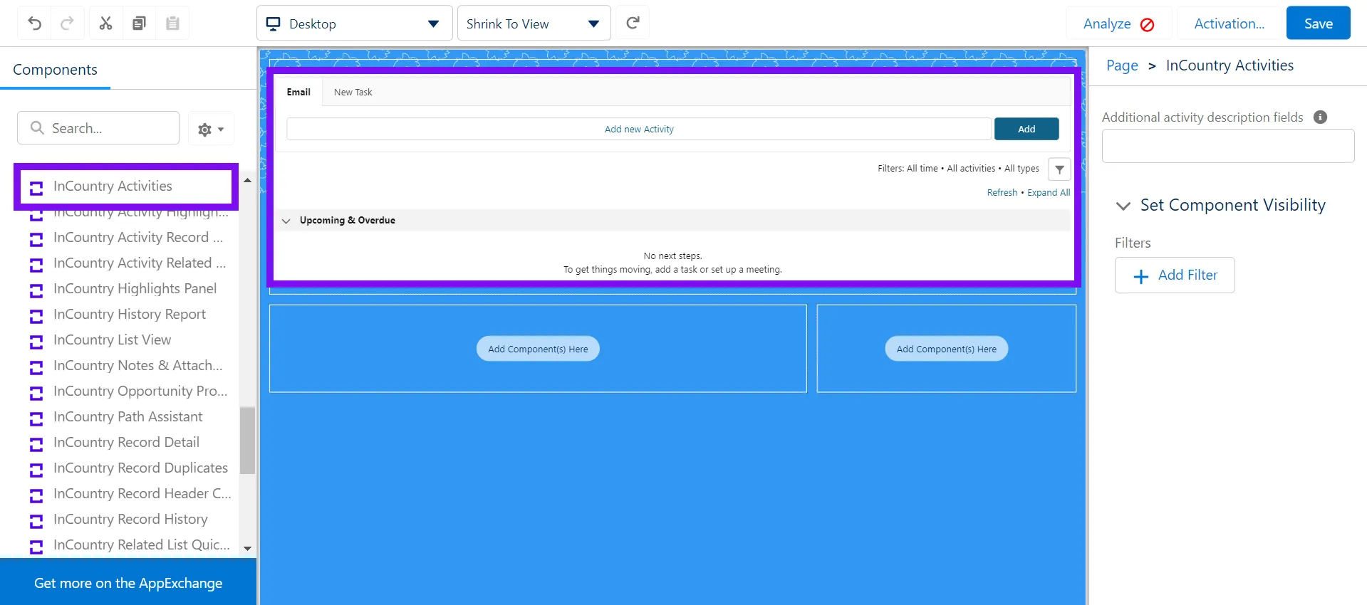 The InCountry Data Residency for Salesforce package provides the Activity component as a replacement for the native Activity component.