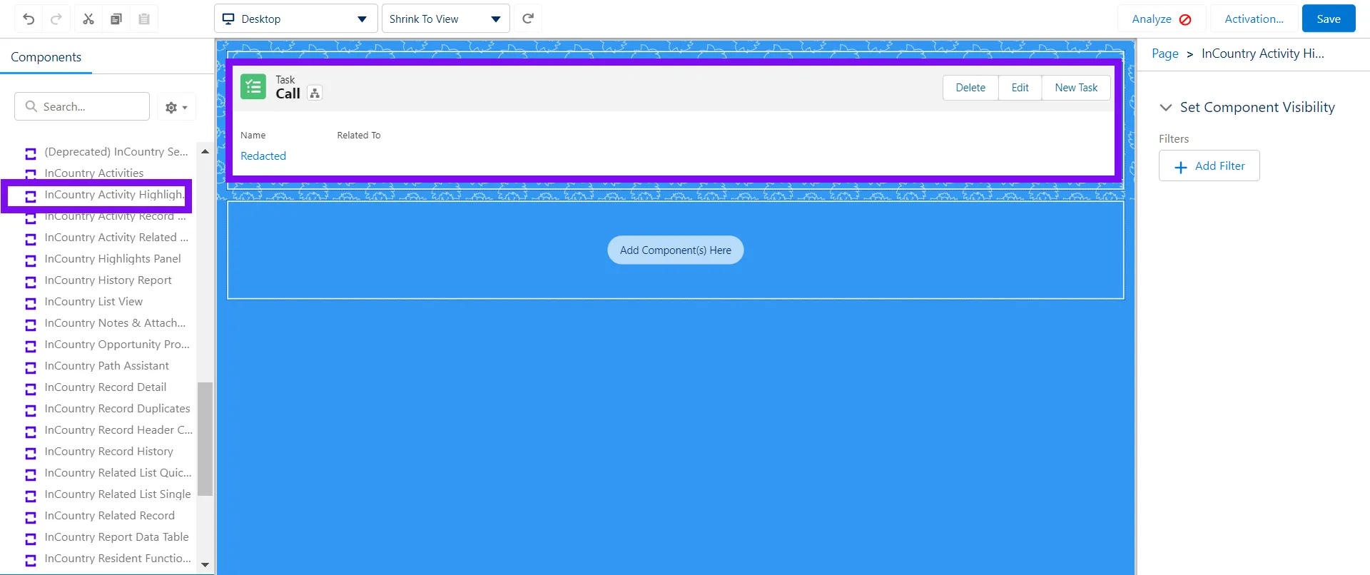 The InCountry Activity Highlights Panel component is a replacement for the native Salesforce component - Highlights Panel presented for the activity object. This component renders the header that contains page-level actions and the block of key activity fields.