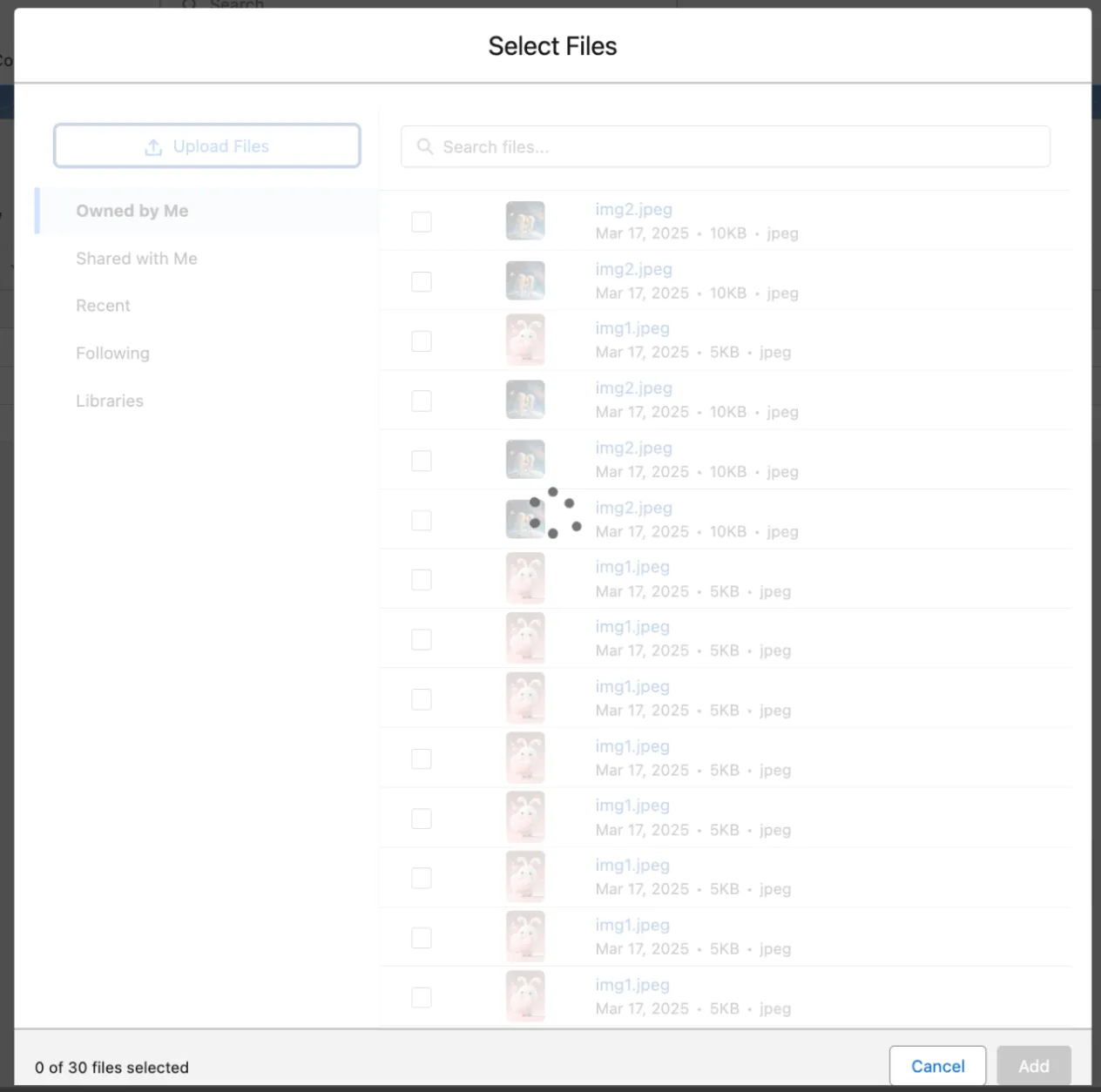 An issue with the loading spinner has been fixed when attaching files. Previously, if the 'Owned by Me' section contained a large file list, the spinner was not visible to the user. This update ensures the spinner is properly displayed during the file attachment process, improving user experience.