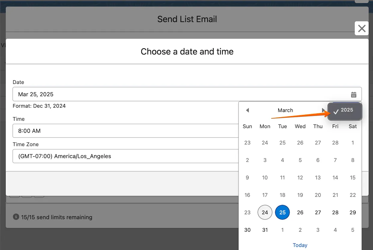 The option to select a year earlier than the current one when scheduling emails has been removed. This update ensures that email scheduling aligns with the current and future timeframes only.