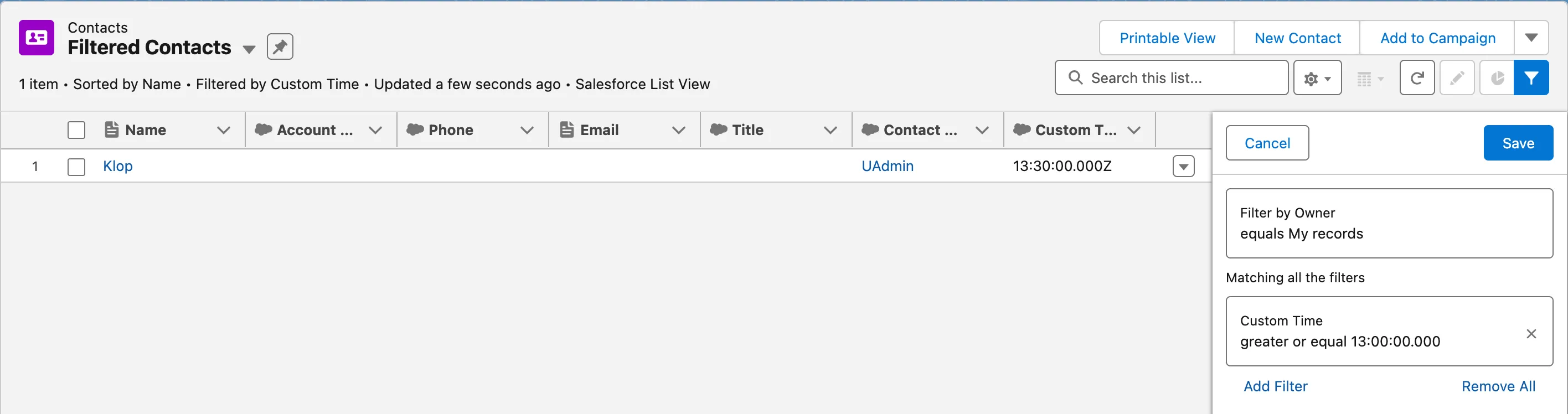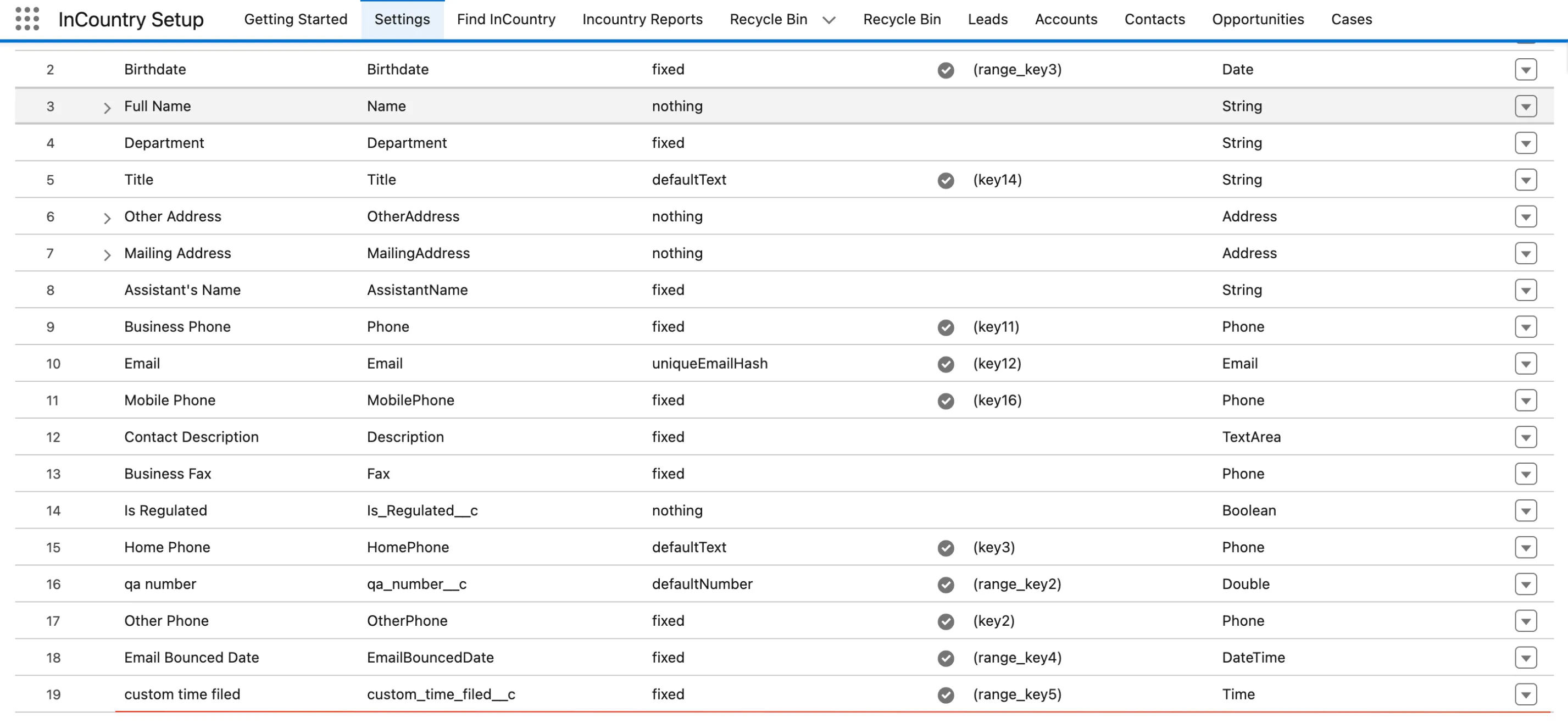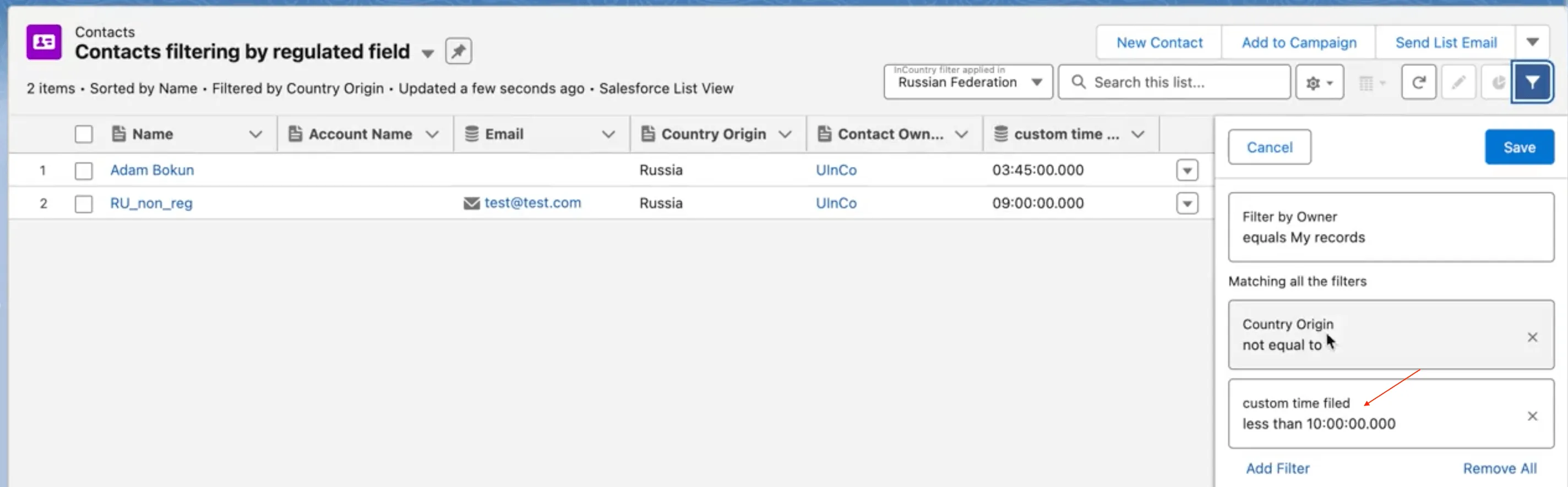 Implemented support for filtering Time type fields in the list view using InCountry, consistent with Salesforce functionality. Additionally, the “key” in the “Searchable” parameter for protected Time fields has been updated to “range_key” to enable accurate filtering.