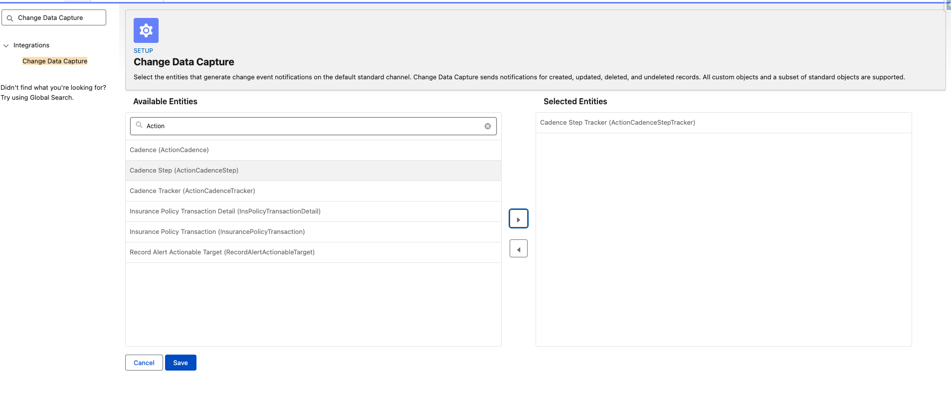 - Go to Setup > Change Data Capture.